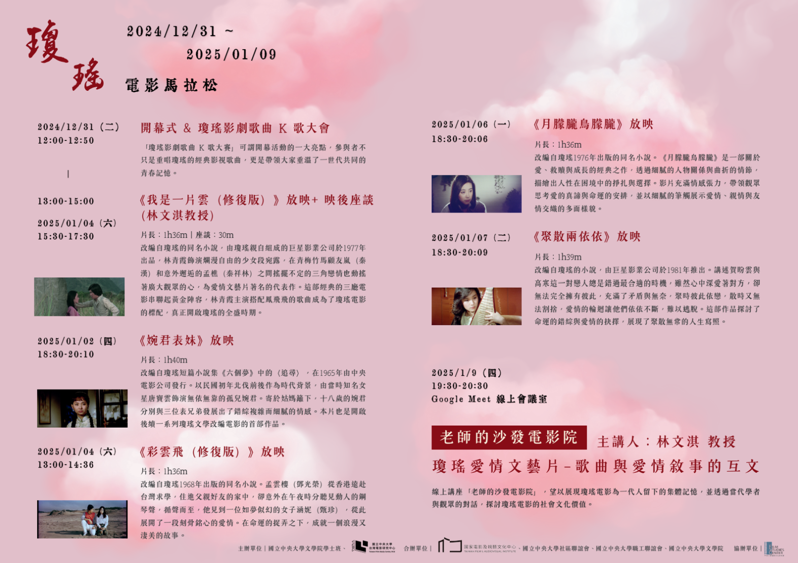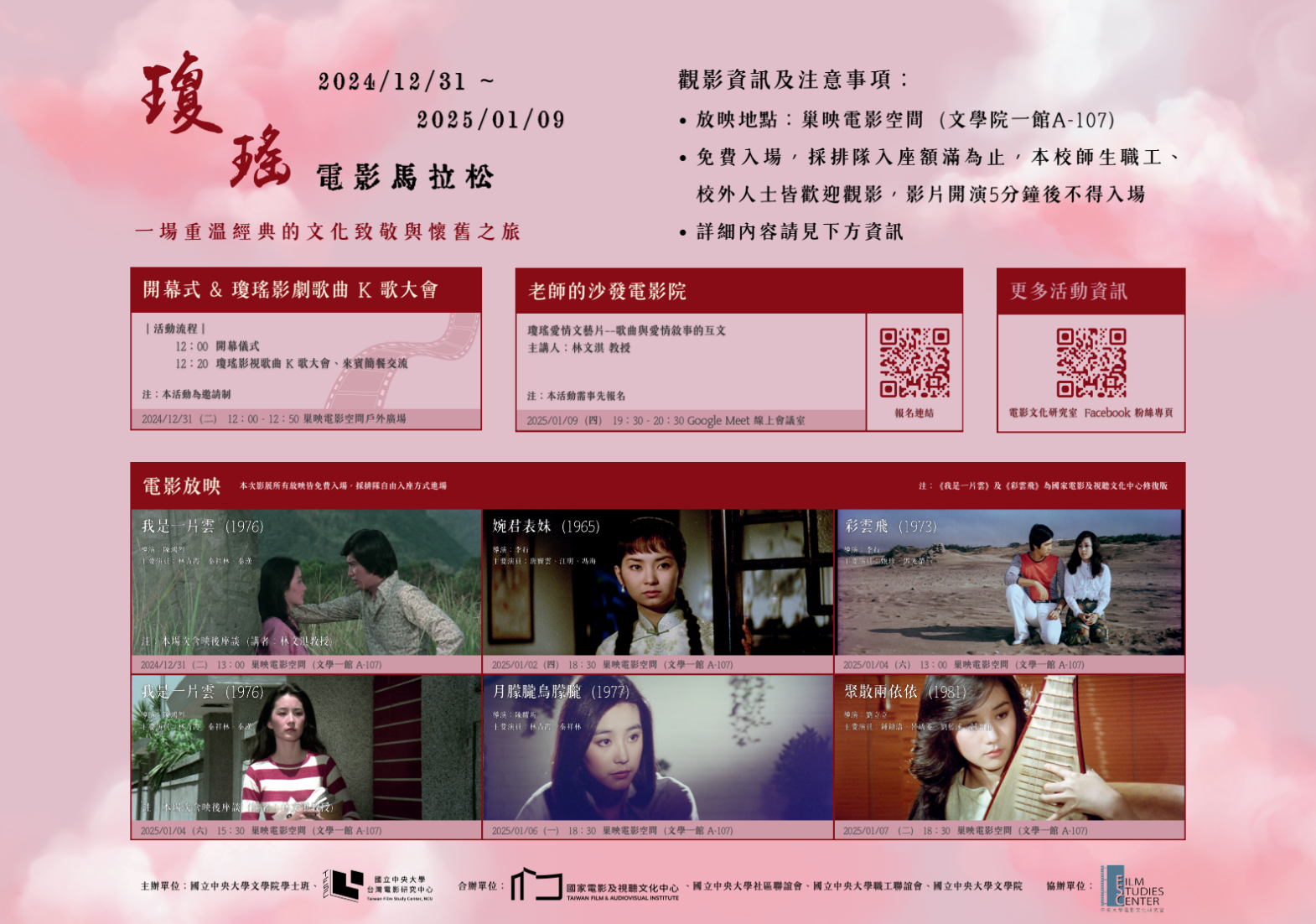 國立中央大學將於114年1月9日舉辦「老師的沙發電影院:瓊瑤愛情文藝 片」,歡迎喜歡電影教學者踴躍報名