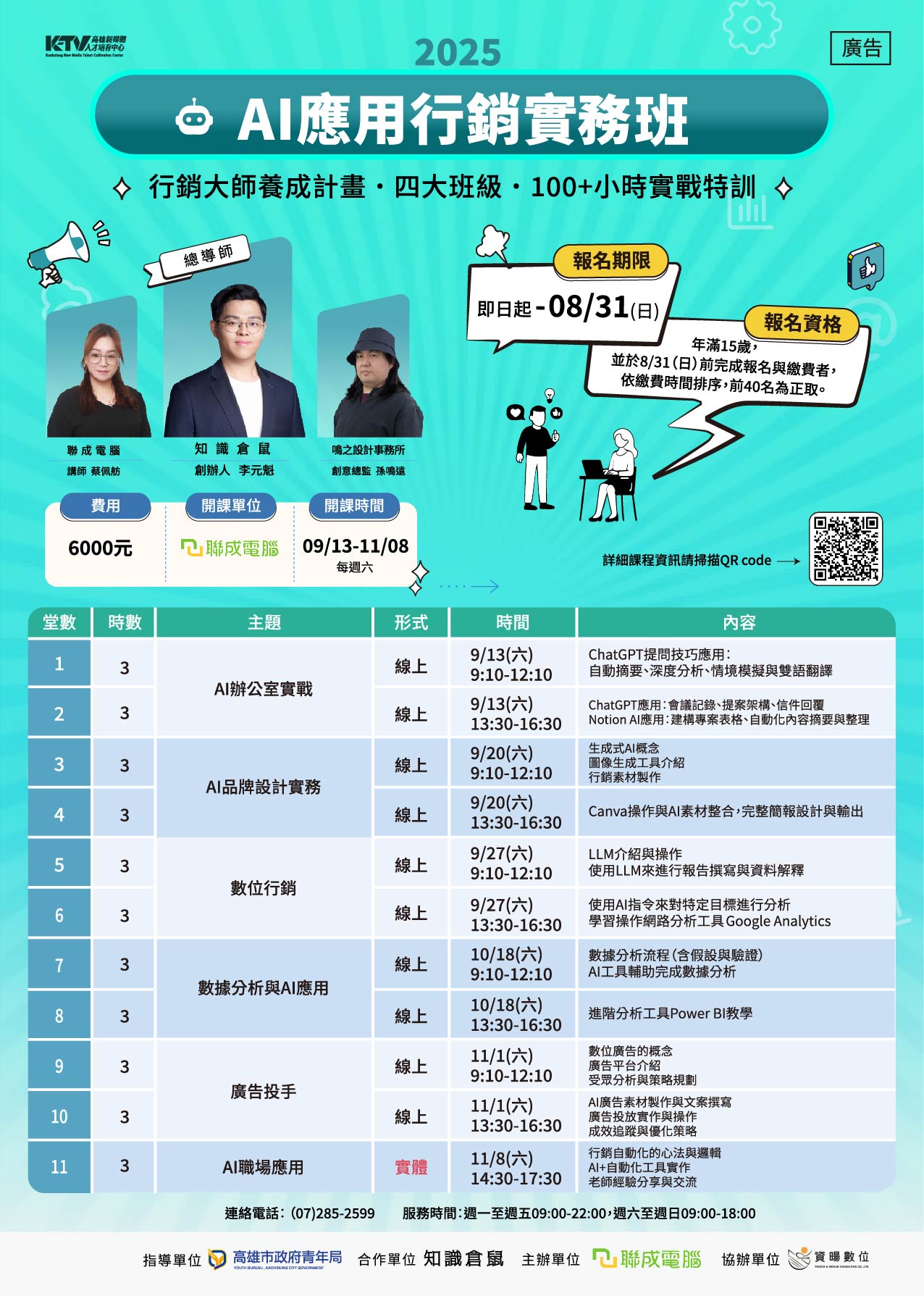 ※另有開設AI應用行銷實務班、新媒體創意培訓班、短影音實戰工作坊細節皆可參考報名連結