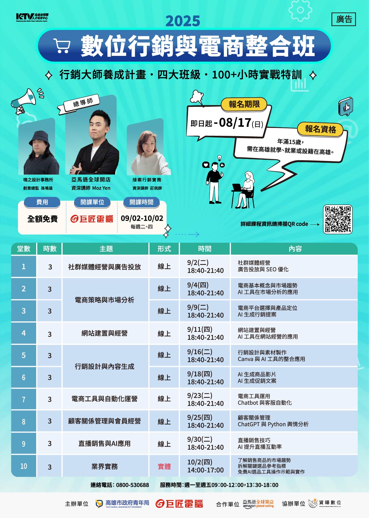 從廣告投放、AI生成影片到客服自動化操作、Python輿情分析、直播銷售技巧,只要是行銷產業需要的,這裡都有喔!