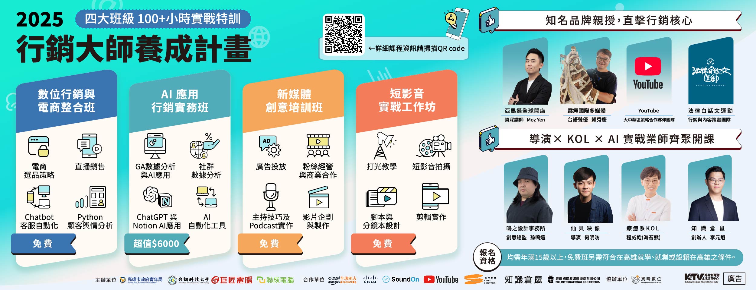 歡迎踴躍報名參加高市青年局舉辦之《行銷大師養成計畫》30小時免費新媒體培訓課