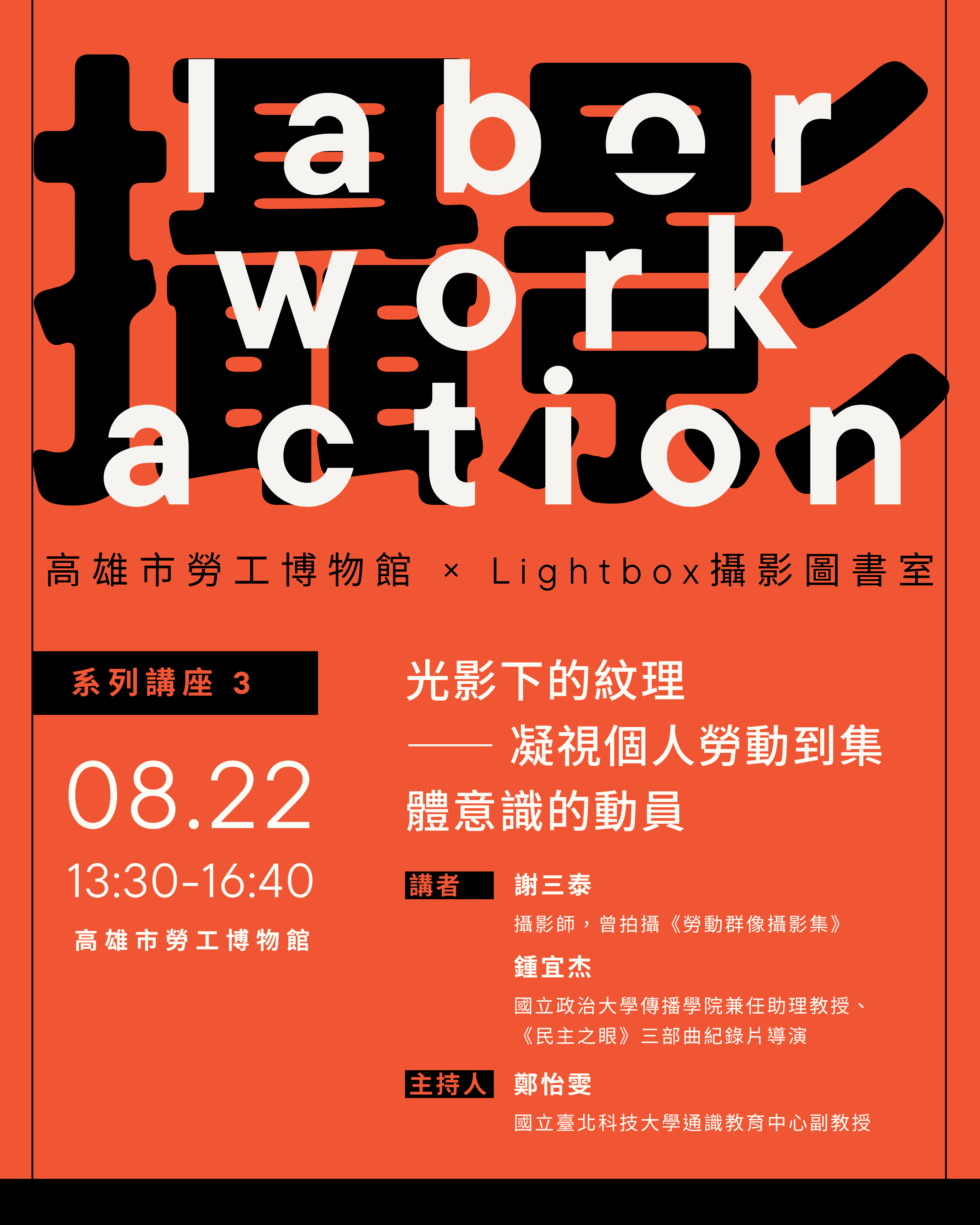 歡迎報名參加高雄市政府勞工局舉辦之「攝影:labor work action」系列專題講座三「光影下的紋理—凝視個 人勞動到集體意識的動員」講座