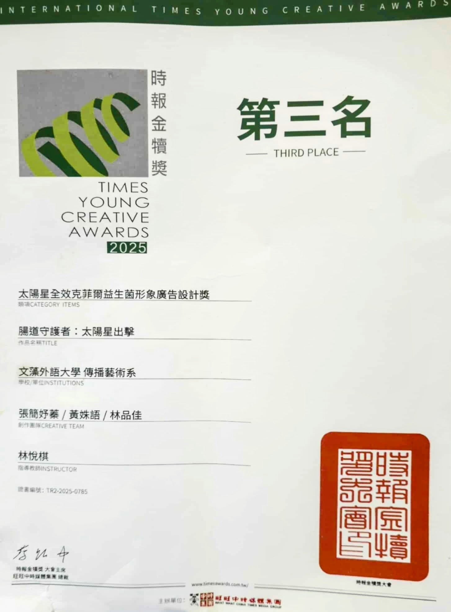 由本系專任教師林悅棋指導學生36名參加第34屆時報廣告金犢獎,提升學生 短片製作企劃和後製包裝專業能力。本次參賽成果共14件入圍獎,3組設計獎, 一組第3名(傳藝系學生張簡妤真、黃姝語、林品佳)。