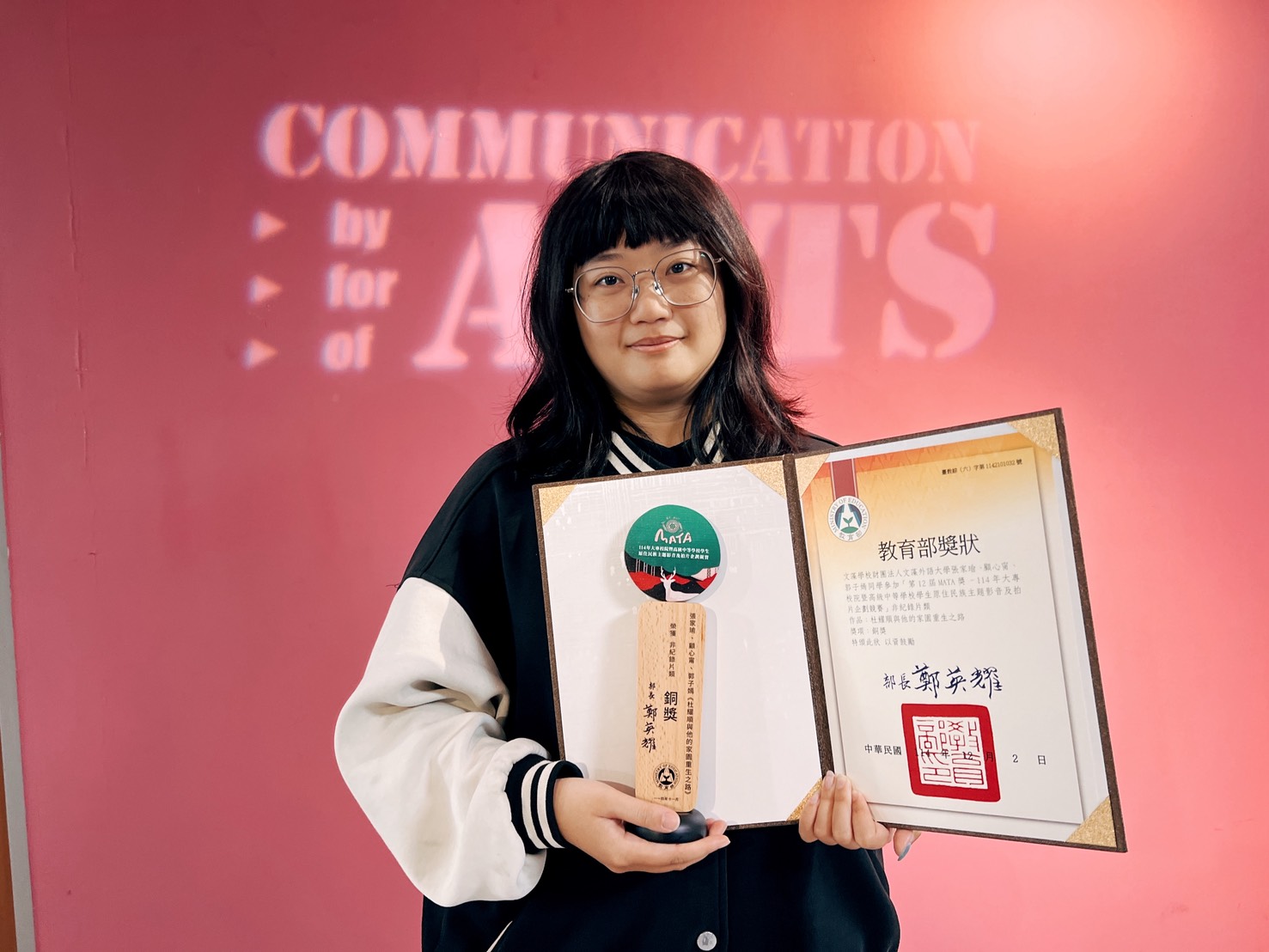 由蔡一峰老師指導傳播藝術系學生張家瑜參加第12 屆MATA 獎—114 年大專校院暨高級中等學校學生原住民族主題影音及拍片企劃競賽,榮獲銅獎