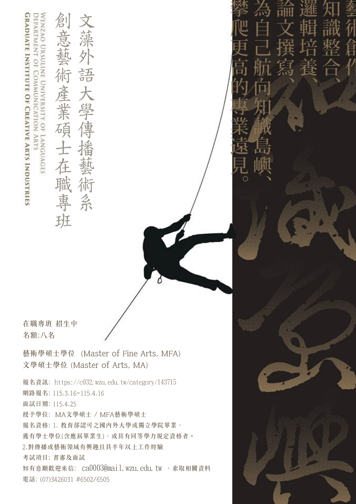 | 文藻外語大學 傳播藝術系創意藝術產業碩士在職專班 115年招生說明 |